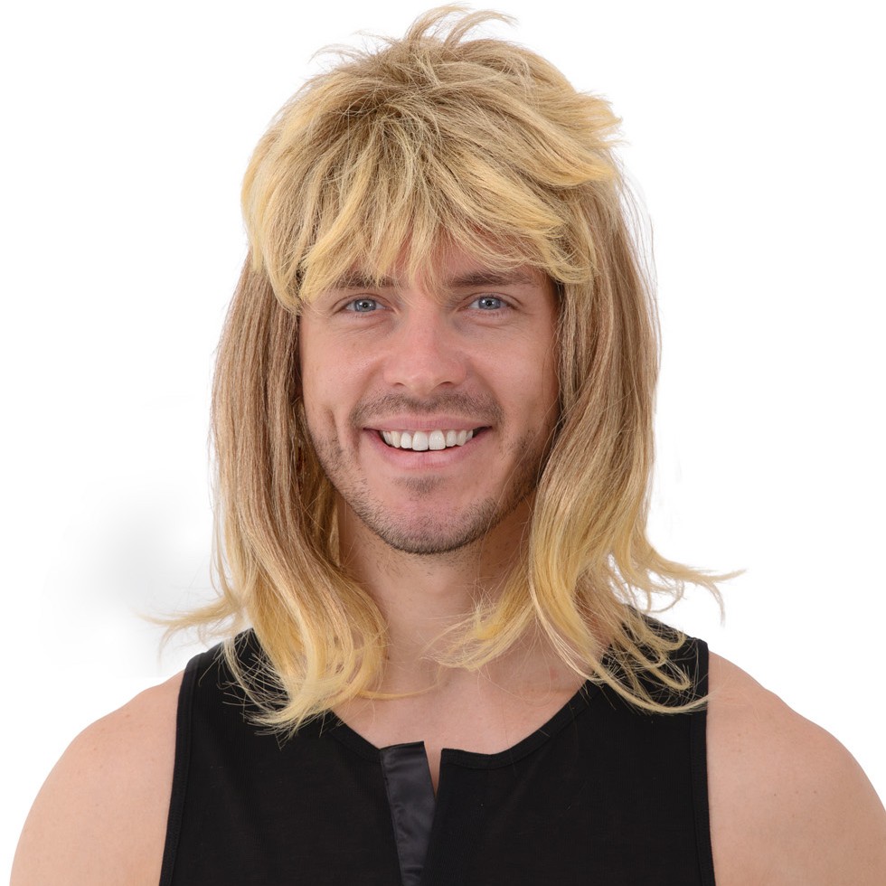 | Pánska stredne dlhá blond parochňa s rozstrapatenými vlasmi v štýle 60., 70. a 80. rokov. a ofinou Parochňa sa ľahko … |