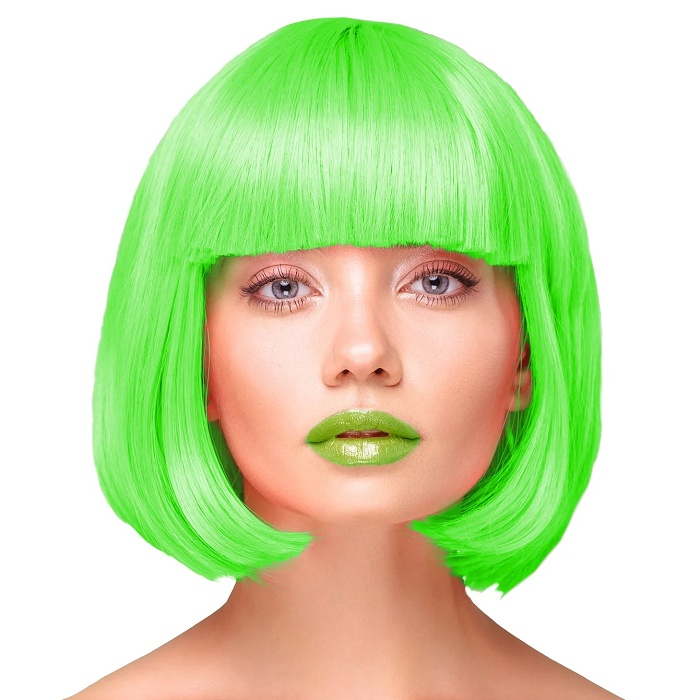 Dámska parochňa s krátkymi neónovo zelenými vlasmi s ofinou dodá vášmu outfitu farebný akcent.