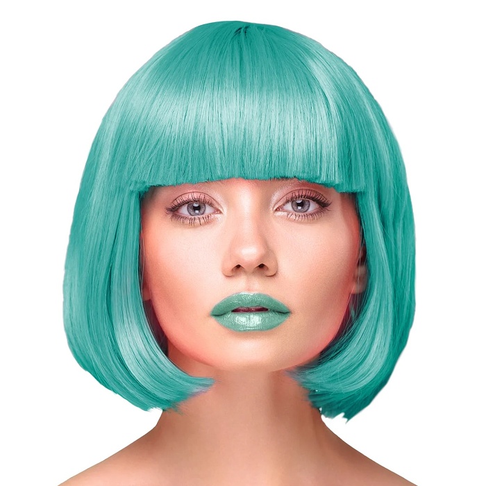 Dámska parochňa s krátkymi tyrkysovými vlasmi s ofinou dodá vášmu outfitu farebný akcent.
