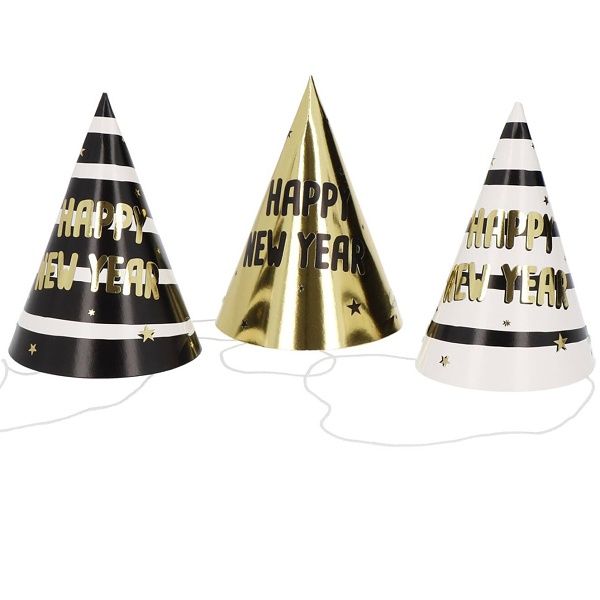 Párty klobúky na oslavu príchodu nového roka. Môžu slúžiť aj ako dekorácia stola.