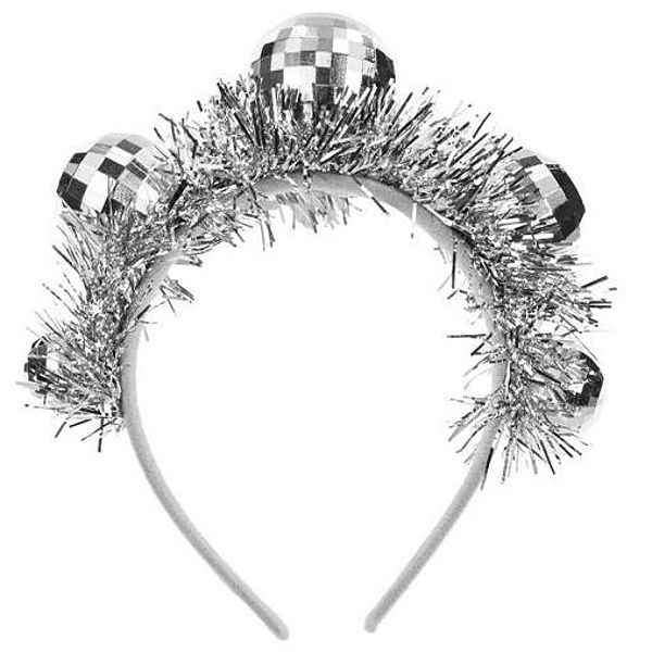 Strieborná čelenka s diskoguľami je dokonalým doplnkom, ktorý dodá iskru každej párty.