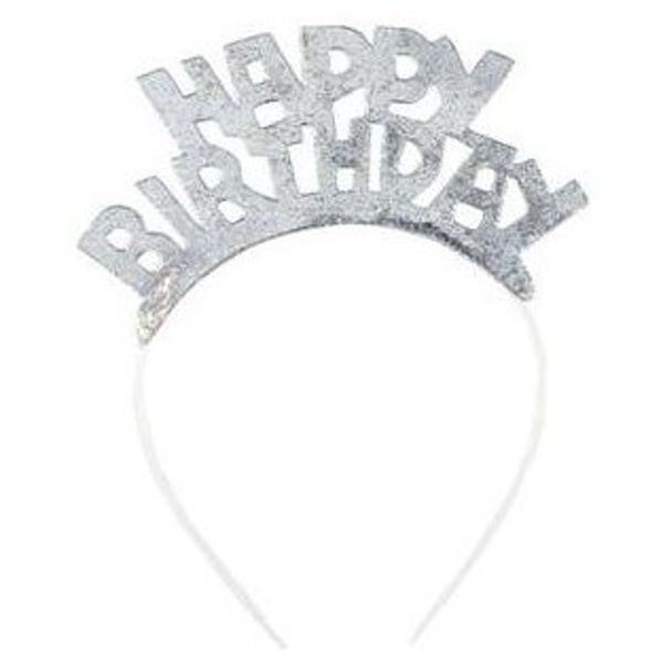 Narodeninová čelenka v bielej farbe so strieborným metalickým nápisom Happy Birthday.
