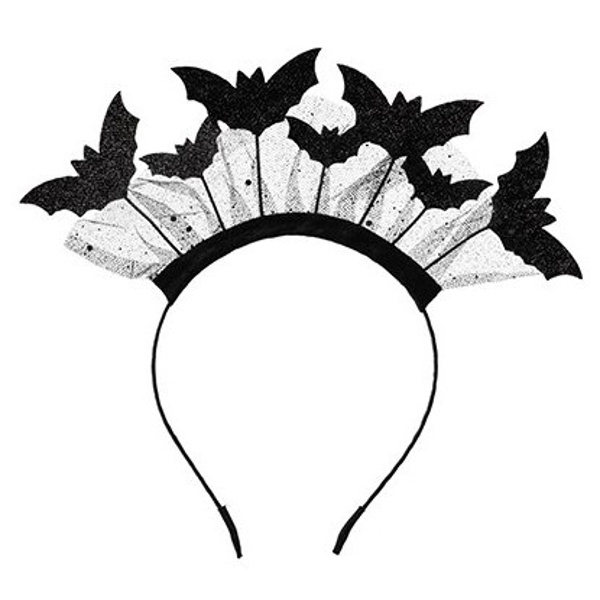 Veľmi originálna dámska kovová čelenka, ozdobená čiernym tylom a netopiermi.
