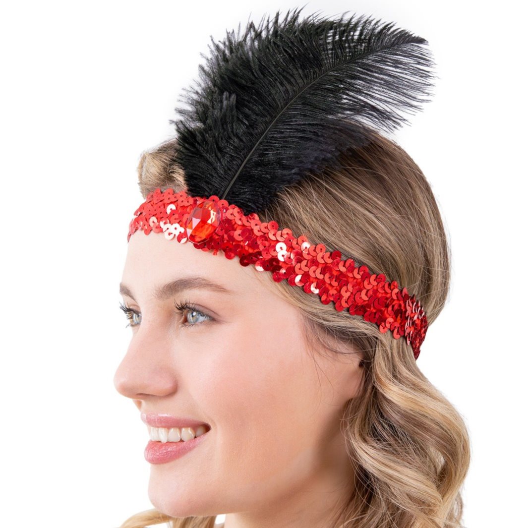 Čelenka na večierok z 20. rokov minulého storočia s červenými flitrami a perím v červenej a čiernej farbe je dokonalým doplnkom, keď chcete svojej párty dodať retro štýl z čias charlestonu.