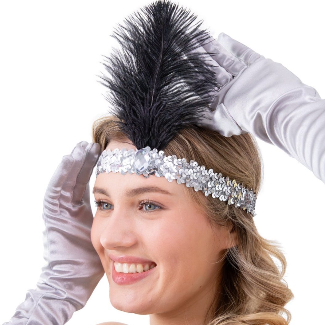 Strieborná, trblietavá čelenka zdobená flitrami okamžite upúta pozornosť, zatiaľ čo čierne pierka dodajú celému outfitu nádych kabaretu a elegancie.