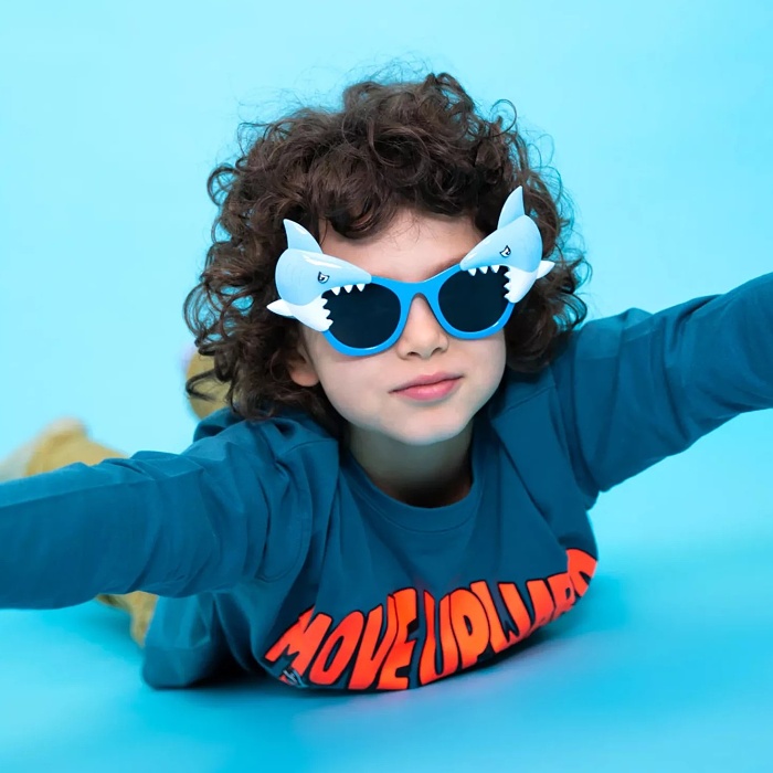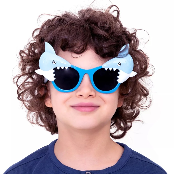 Originálne párty okuliare s motívom žraloka. Okuliare sú modré a strany rámov sú zdobené žralokom na každej strane.