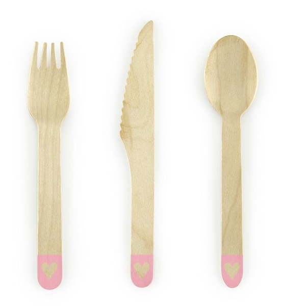 Príbory sú vo farbe prírodného dreva so svetlo ružovým zafarbením a ornamentom srdiečka.