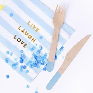 Príbory sú vo farbe prírodného dreva so svetlo modrým zafarbením.
