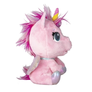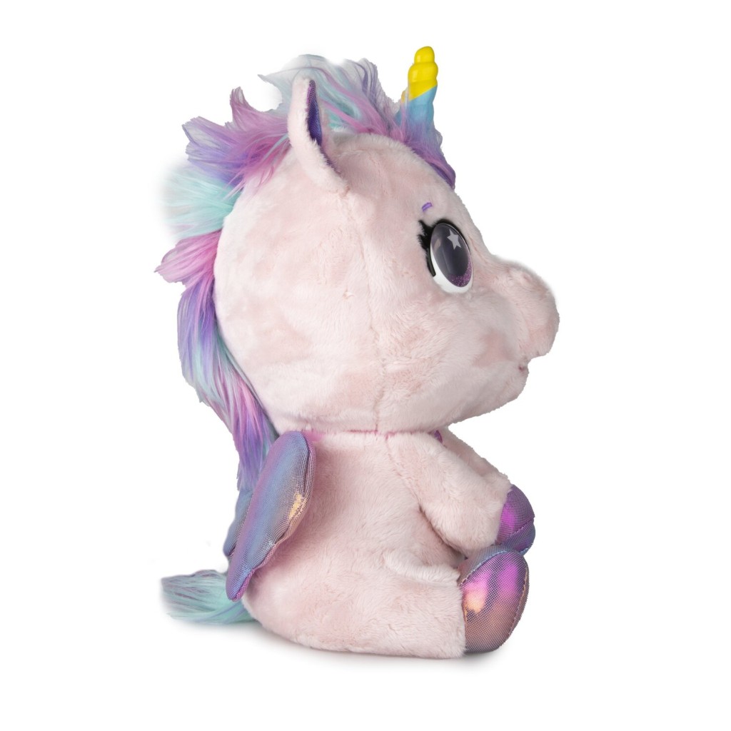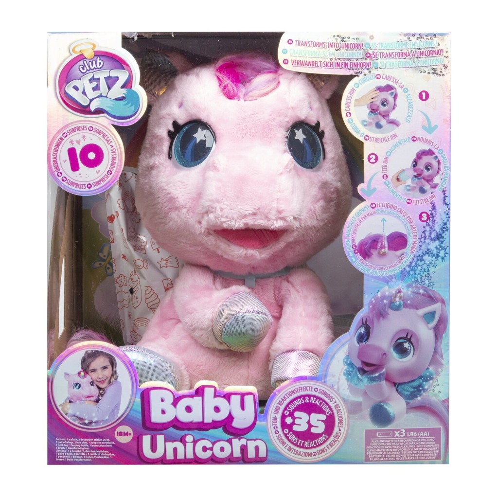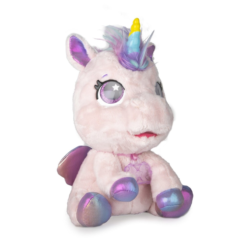 - Interaktívny plyšový poník, ktorý sa vďaka vašej starostlivosti zmení na jednorožca. Prekvapí vás viac ako 30 zvukmi a interakciami. Hladkajte, česajte, kŕmte a sledujte, ako poníkovi v 3 fázach magicky narastie farebný roh. Obsahuje 9 rôznych doplnkov (fľaša, hrebeň, krídla, klipsy, samolepky, prívesok, osvedčenie o adopcii). Dokončite premenu svojho poníka na jednorožca pripnutím dúhových krídel a prívesku. K dispozícii sú 3 rôzne farebné varianty (biela, ružová, modrá). Vyžaduje 3× batérie AA, nie sú súčasťou balenia.