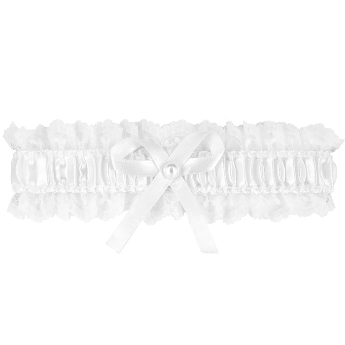 Svadobný čipkovaný biely podväzok s mašľou, ktorý je uprostred zdobený malou lesklou perlou.