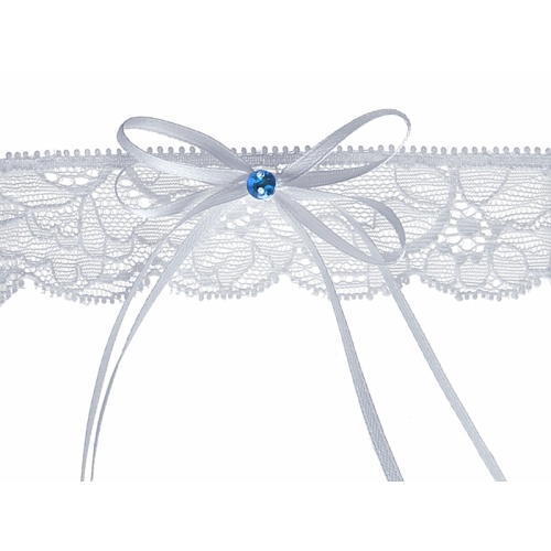č. 55PDW15 strong> p> Čipkovaný svadobný podväzok strong> p> tradičný doplnok pre nevestu p> decentná biela čipka s malým modrým kamienkom p>