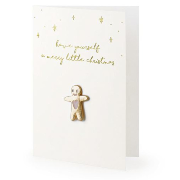 Biela karta so zlatou metalickou potlačou "Majte krásne Vianoce" a smaltovaným špendlíkom v tvare pána