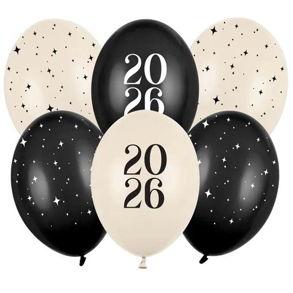 1x balón v elegantnej pastelovej čiernej farbe s priehľadnou potlačou "2026", 2 balóny v pastelovej čiernej farbe zdobené hviezdičkami, 1x balón v pastelovej béžovej farbe s potlačou "2026" a 2 balóny v pastelovej béžovej farbe zdobené hviezdičkami.