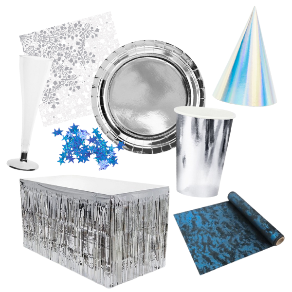 Vytvorte elegantnú a štýlovú atmosféru na poslednú noc v roku! Táto modrá a strieborná párty súprava pre 12 osôb dodá vášmu silvestrovskému stolu lesk, šarm a slávnostnú náladu, ktorá očarí všetkých vašich hostí.