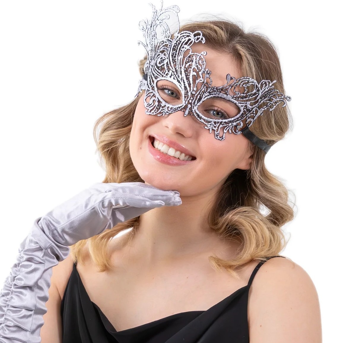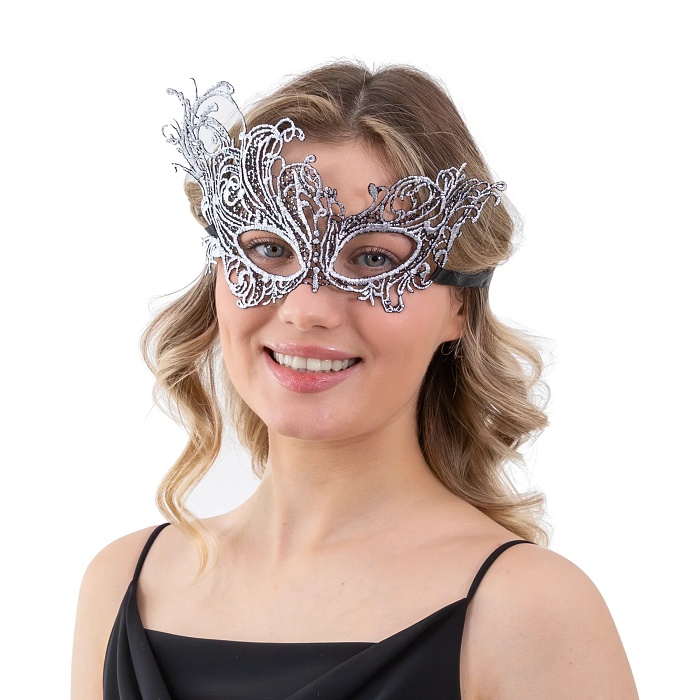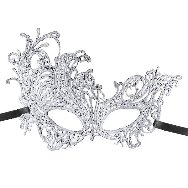 Maska z benátskej čipky v striebornej farbe.