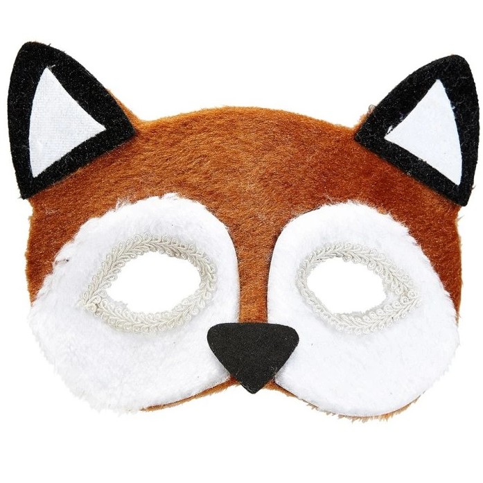 Maska s vyobrazením hlavy líšky je vyrobená z mäkkého plyšu. Okraje okolo očí sú zdobené bielou stuhou.