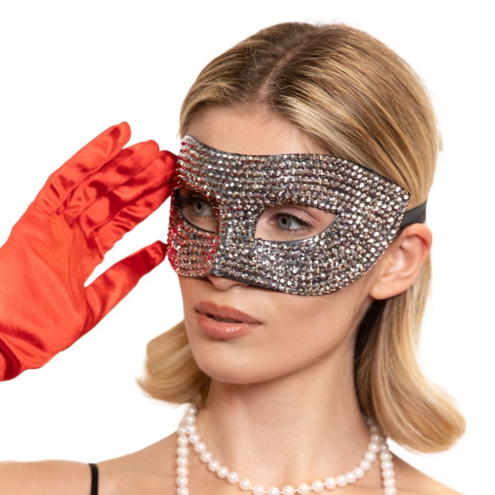 Táto elegantná karnevalová maska, bohato zdobená trblietavými kamienkami, okamžite upúta pozornosť a dodá jedinečný nádych každému oblečeniu.