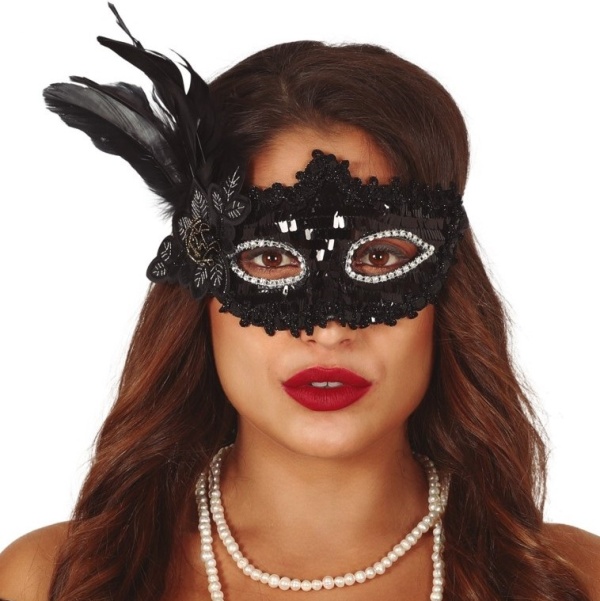 tematickú oslau. S touto čiernou a veľmi elegantnou škraboškou s čiernymi pierkami budete vítaným