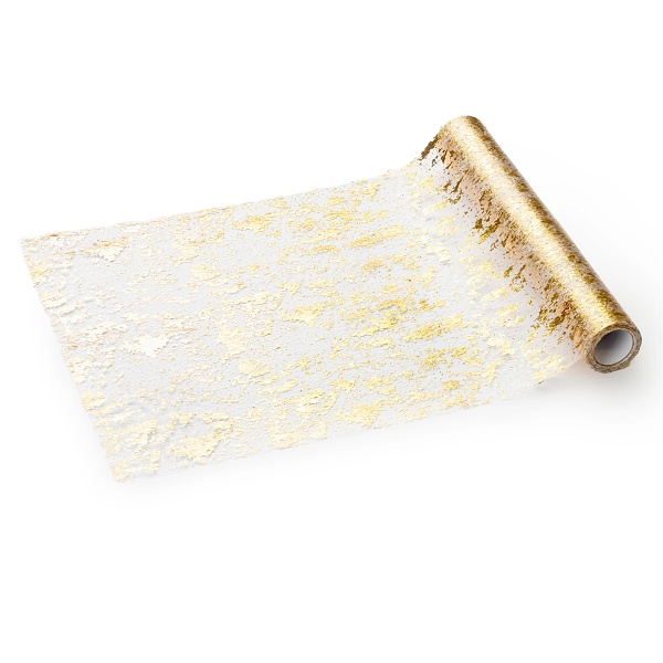 Tento sieťovaný behúň na stôl so zlatou metalickou potlačou je elegantnou dekoráciou stola, ktorá sa hodí na všetky druhy osláv a večierkov.