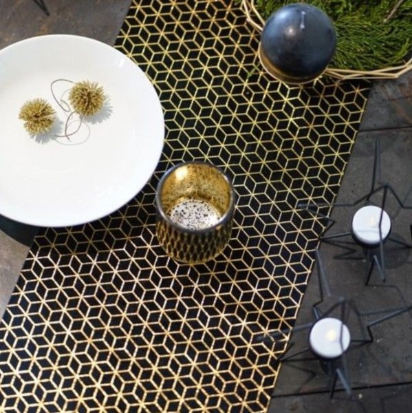 | Čiernozlatá šerpa na stred stola. Zamatová čierna stredová šerpa je s geometrickými zlatými vzormi. Veľmi pekne vám … |
