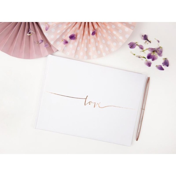Biela svadobná kniha s pevnou väzbou s nápisom Love vo farbe ružového zlata.