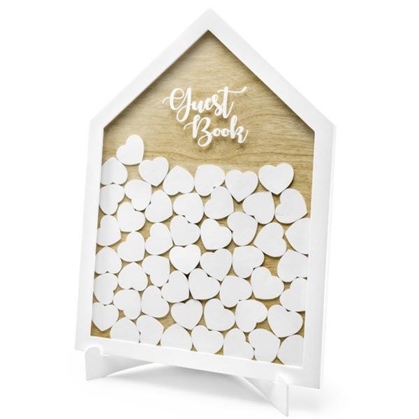 Svadobný drevený domček s bielymi malými srdiečkami (50ks), na ktoré hostia umiestnia svoj podpis alebo krátky odkaz a priania pre novomanželov a potom hodia dovnútra.
