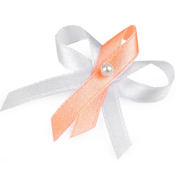 (bielej a lososovej) o šírke 6mm a perleťovej perličky. Svadobnú mašličku je možné použiť aj na dozdobenie