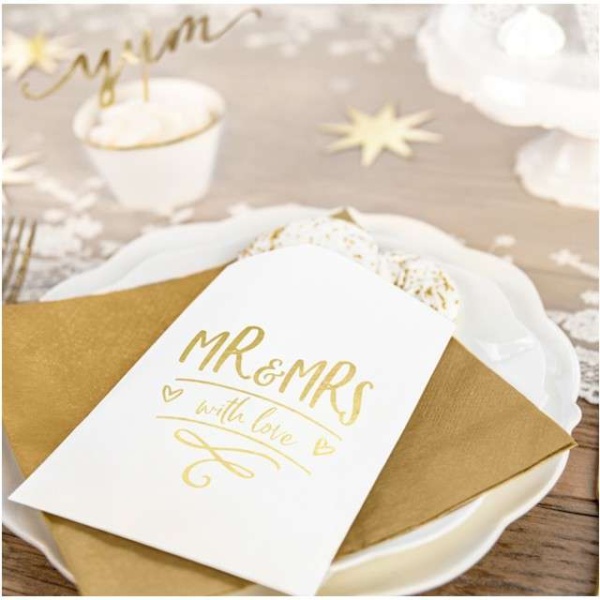 Papierové vrecko v bielej farbe so zlatým nápisom Mr&Mrs na sladkosti je skvelá výzdoba a zároveň praktická pozornosť.