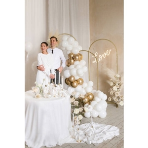Konštrukcia na pozadie v tvare oblúka, vyrobená z ocele zlatej farby. Táto konštrukcia je navrhnutá tak, aby vytvorila pôsobivé pozadie, ktoré dodá vašim fotografiám nádych pôvabu a elegancie. Je ideálna na svadby, krstiny, narodeninové oslavy a mnoho ďalších slávnostných príležitostí.