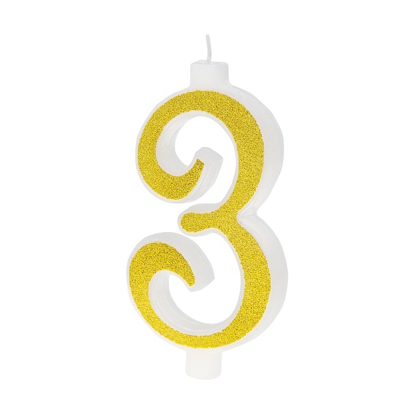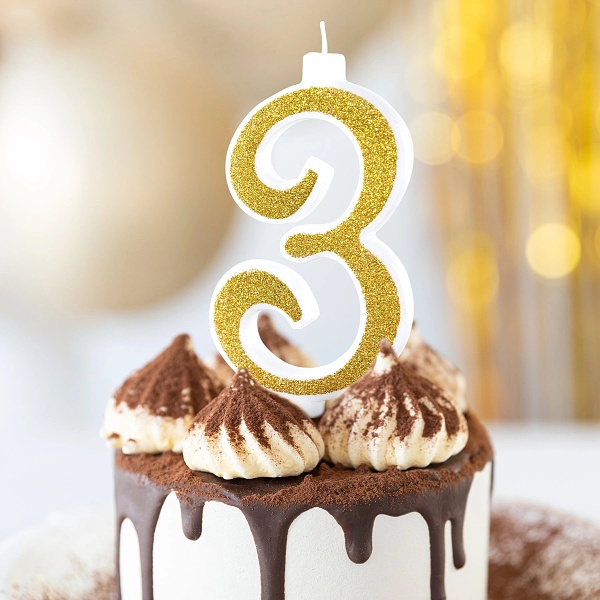 Veľká zlatá sviečka s trblietkami v tvare čísla 3 je nevyhnutným doplnkom narodeninovej torty.