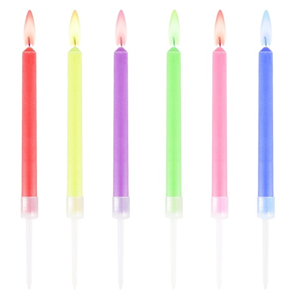 Narodeninové sviečky s plameňmi v červenej, fialovej, modrej, zelenej a žltej farbe