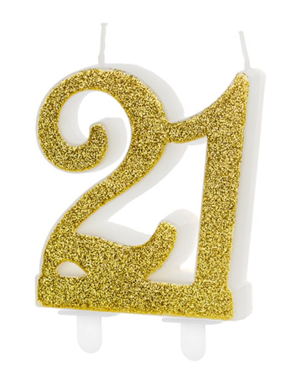 Narodeninová sviečka číslo 21 v zlatej trblietavej farbe, veľkosť približne 7,5 cm.