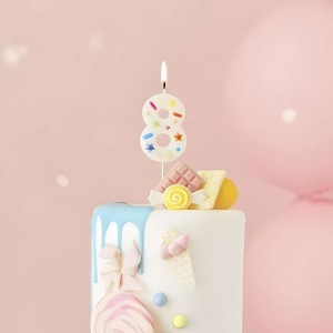 Túto narodeninovú sviečku zdobia farebné konfetové prúžky a hviezdičky v jemných pastelových farbách, ktoré jej dodávajú veselý vzhľad.