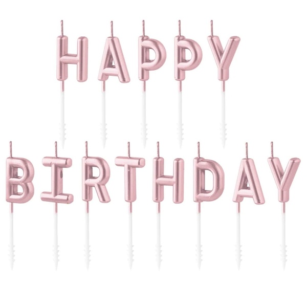 Sada sviečok na tortu s písmenami tvoriacimi nápis Happy Birthday v ružovom zlate