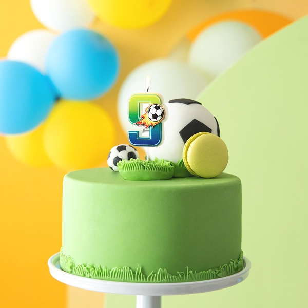 Sviečka má žiarivé farby a detailný dizajn v tvare čísla deväť doplnený o futbalový motív.