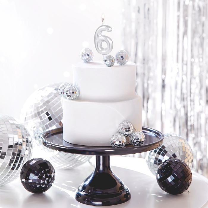 Tortová sviečka číslo 6 lesklá strieborná