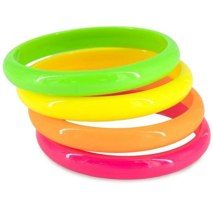 Sada štyroch neónových náramkov, ktoré sa hodia ku kostýmu na diskotékovú párty v 80. rokoch.