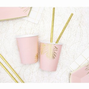 Papierové jednorázové kelímky v svetloružovej farbe so zlatou podtlačou lístkov.
