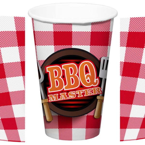 Jednorazové papierové tégliky s nápisom BBQ Master vám uľahčia grilovanie s priateľmi a krásne ozdobia záhradnú párty v retro americkom štýle.
