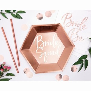 Papierové taniere s nápisom Bride squad vo farbe ružového zlata sú skvelý doplnok stolovania pre všetky vaše kamarátky, ktoré sa zúčastnia vašej rozlúčky so slobodou.