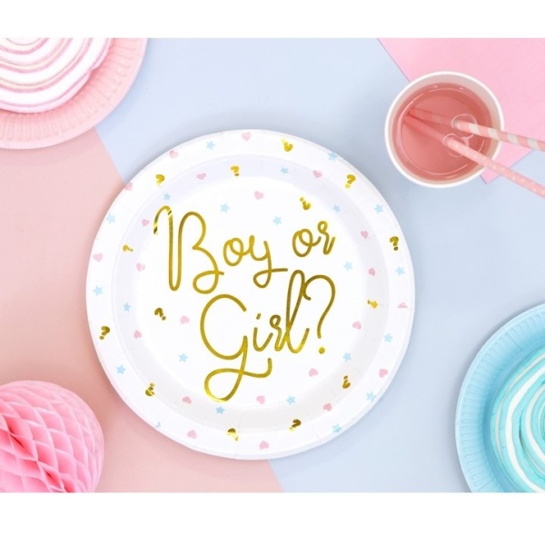 Papierové tanieriky v bielej farbe so zlatým nápisom "Boy or girl?".