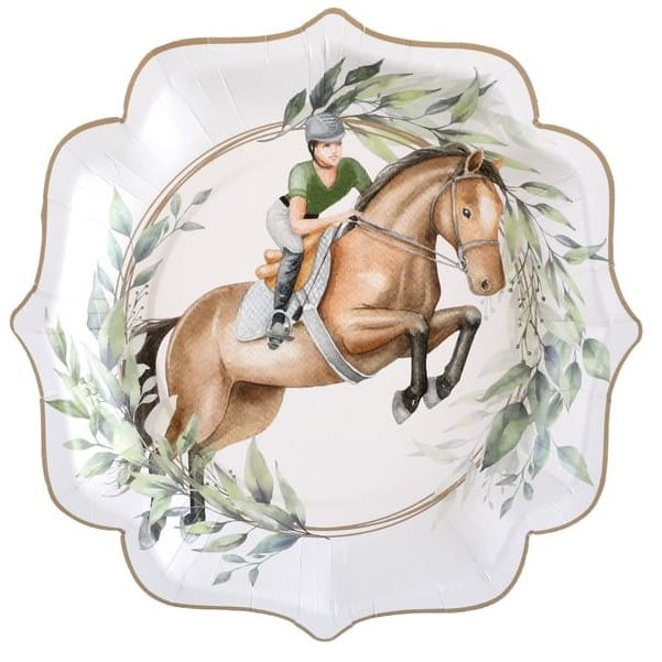 Papierové jednorazové taniere s vrúbkovaným okrajom v motíve jazdeckého koňa.