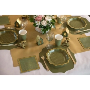 Dekorácia či doplnky, kde sa mieša olivová farba so zlatou má vždy veľký úspech a eleganciu a váš stôl bude s týmito doplnkami trblietavý a trendy.