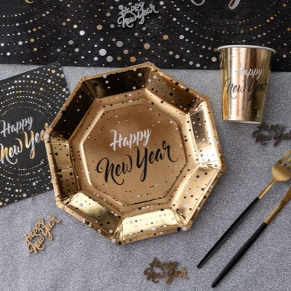 Zlaté osemhranné papierové taniere s nápisom Happy New Year.