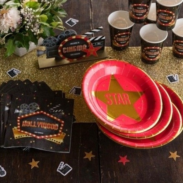 Červené tanieriky Hollywood so zlatou hviezdou a okrajom sú dôležitým doplnkom stolovania tématickej