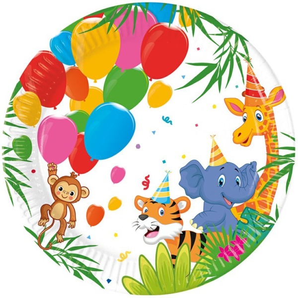Papierové jednorazové tanieriky Džungľa balóniky so zvieratkami z džungle v pestrách farbách nesmú