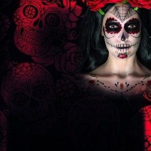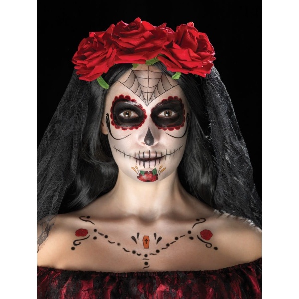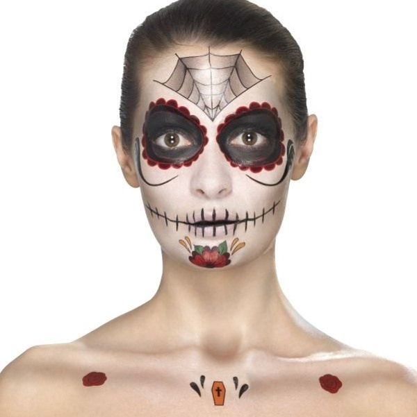 Súprava make-upu Deň mŕtvych obsahuje téglik s bielymi a čiernymi farbami na tvár, 1 x malú čiernu ceruzku na líčenie, 9 ks dočasných tetovaní v štýle Sugar Skull a make-up štetec a hubku.
