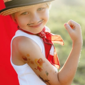 Zábavné dočasné tetovanie, ktoré bude hitom pre najmenších. Tetovanie má zábavný dizajn s cirkusovým motívom a hviezdičkami.