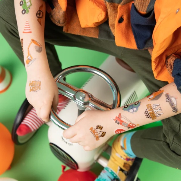 Skvelá súprava umývateľných tetovaní, ktorá uspokojí každého malého fanúšika motorových vozidiel a stavebných prác.
