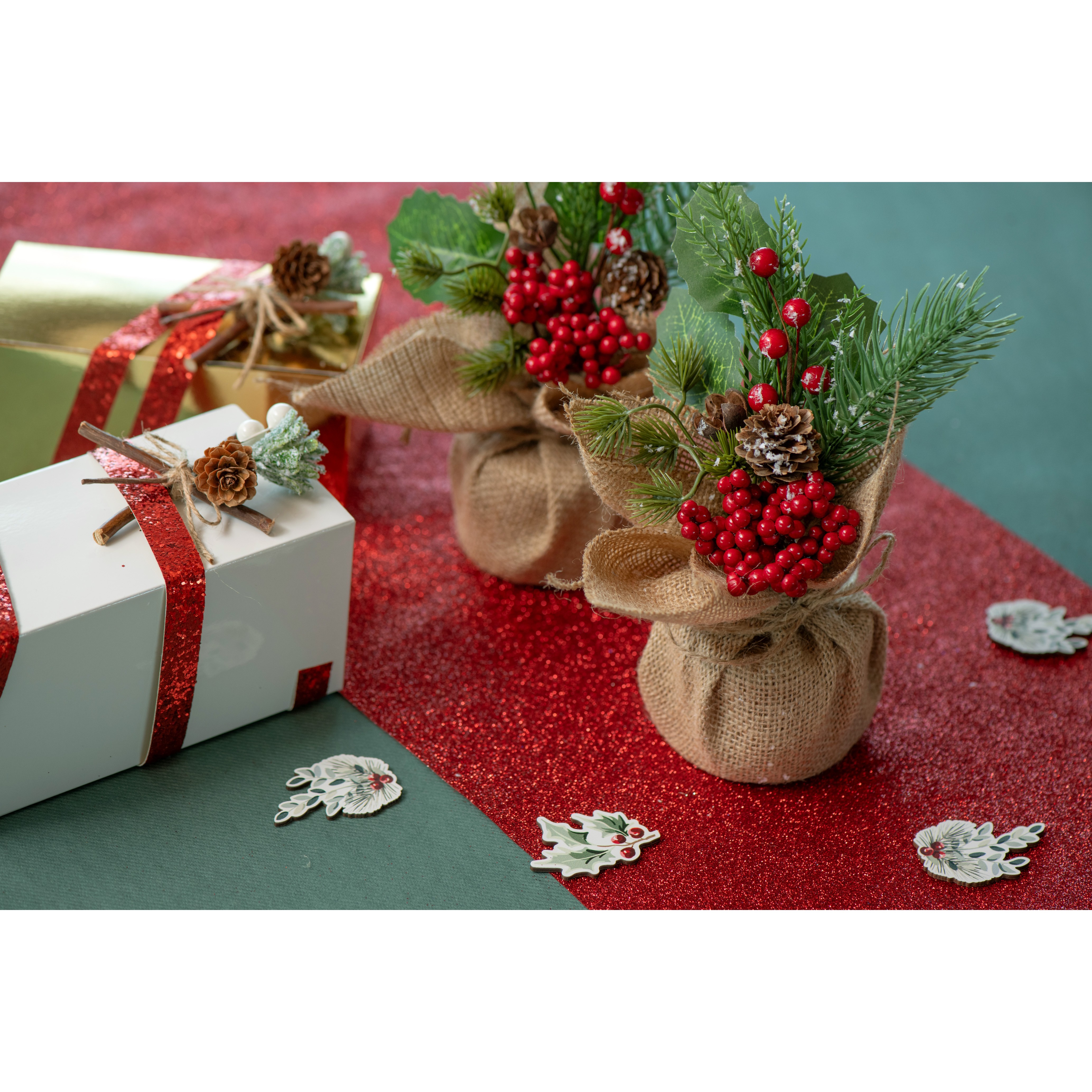 Dekorácia obsahuje ozdobné vetvičky, červené brusnice a šišky. Všetko je zabalené do jutového materiálu, ktorý dekorácii dodáva rustikálny charakter.
